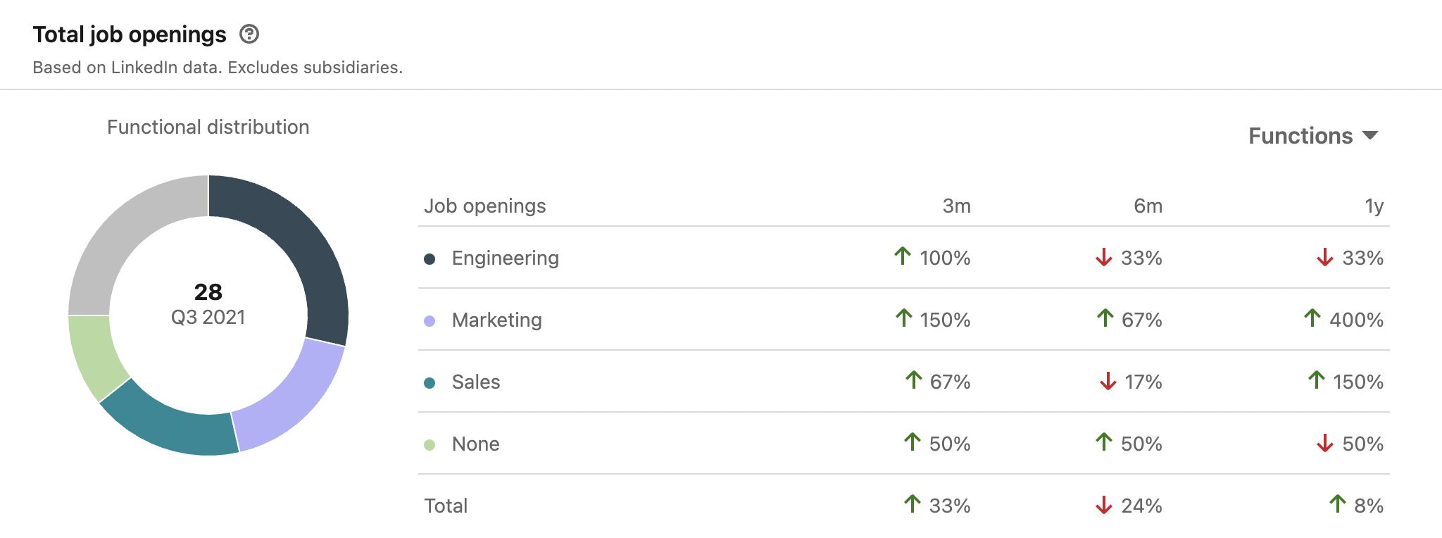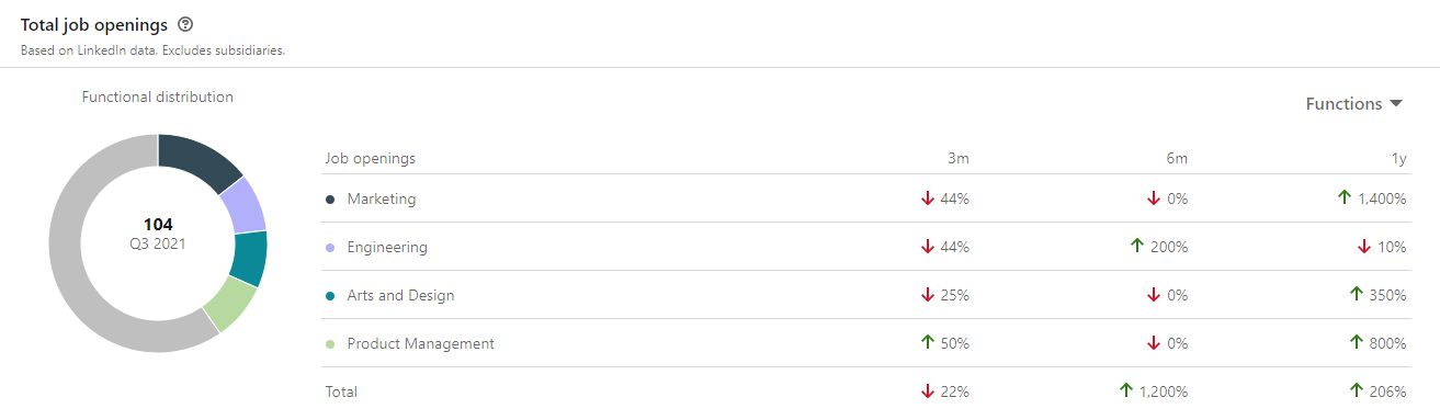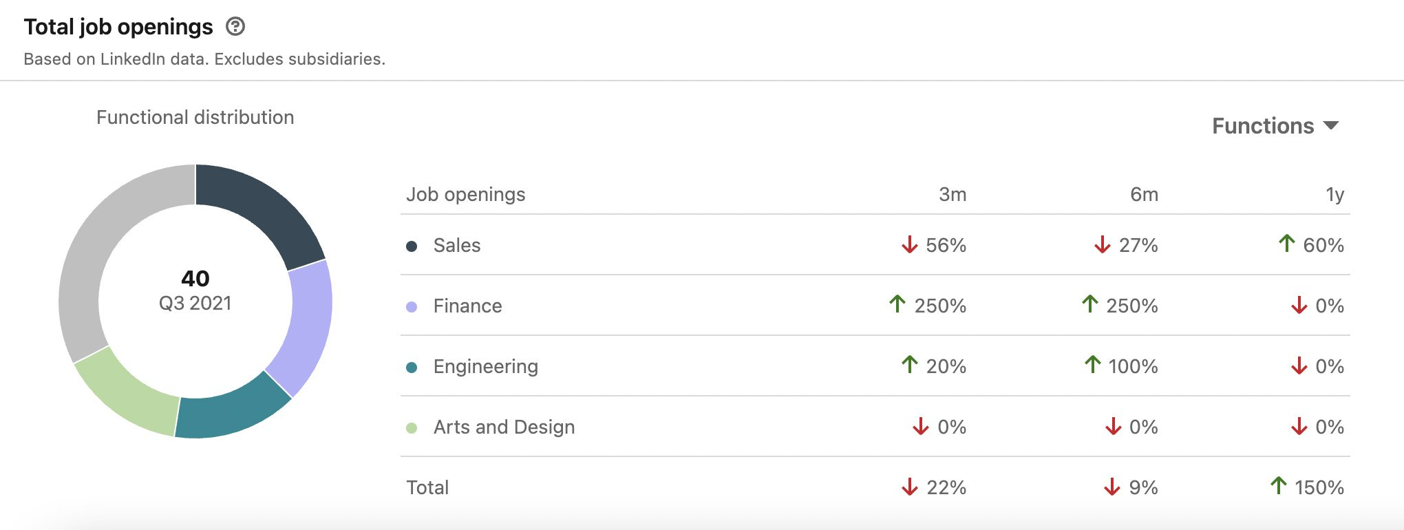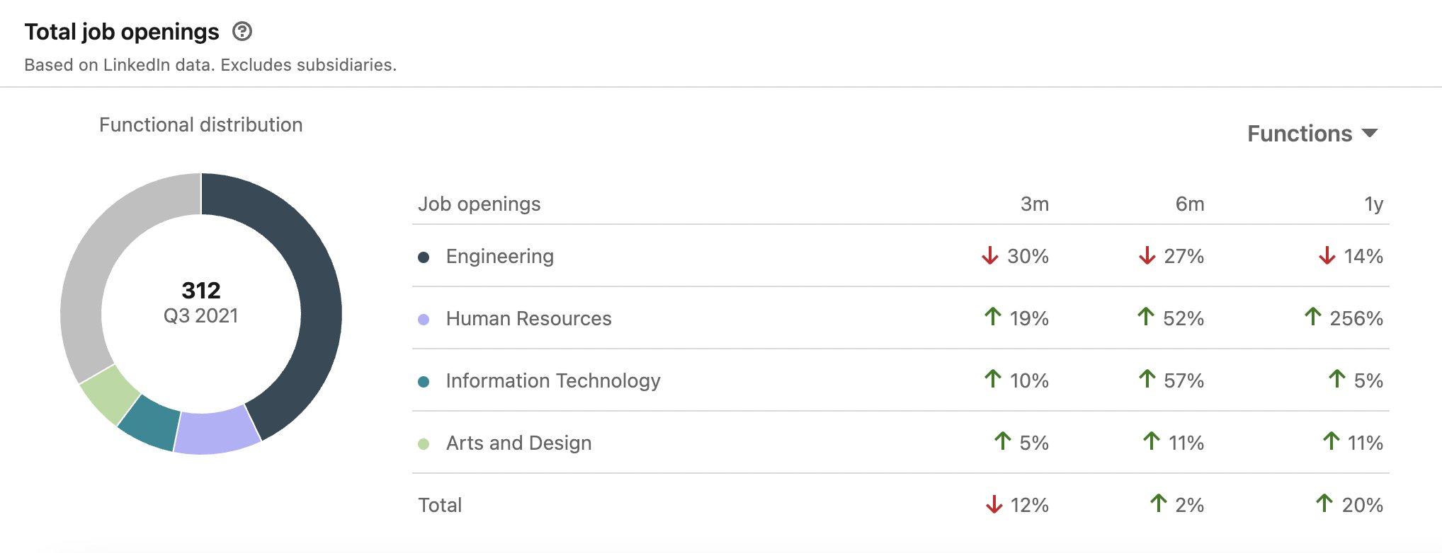 Job openings down over last three months by 23% but up 95% over last six months. Recent hires not from LinkedIn?