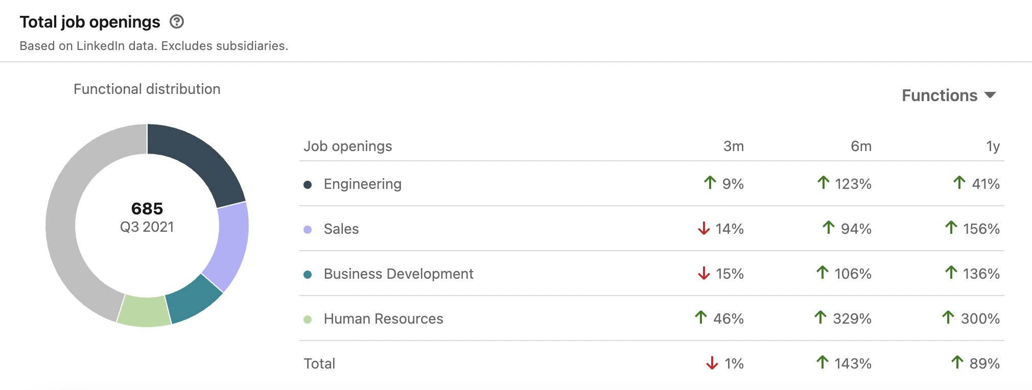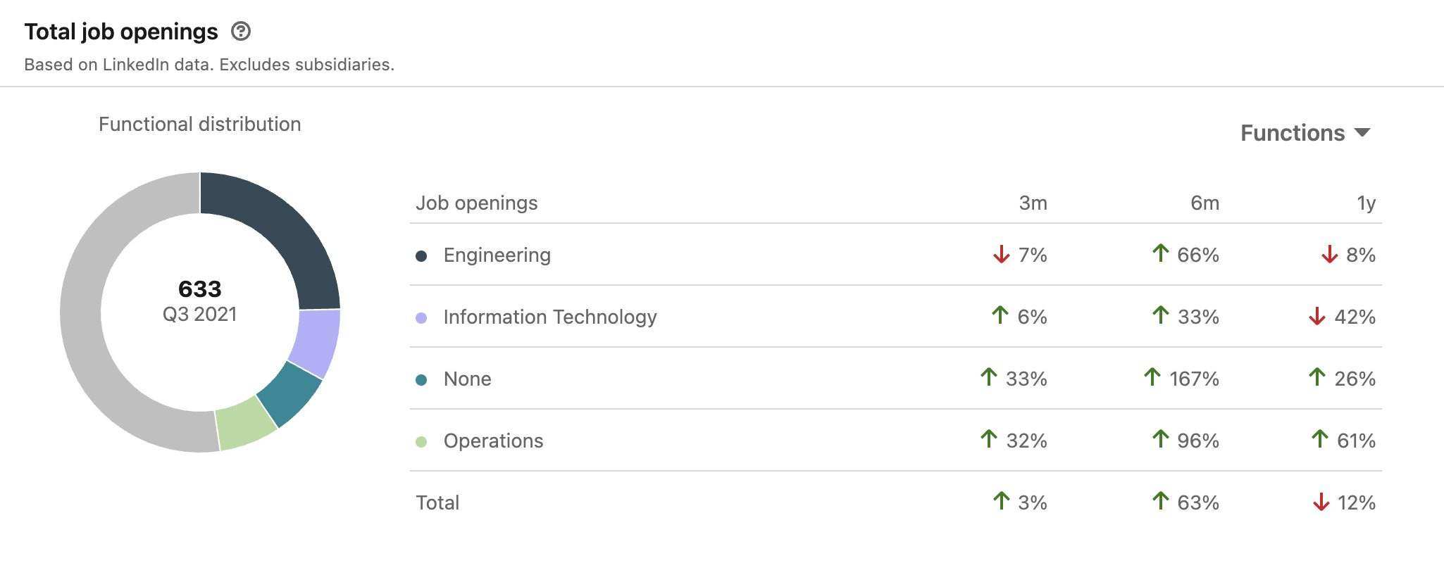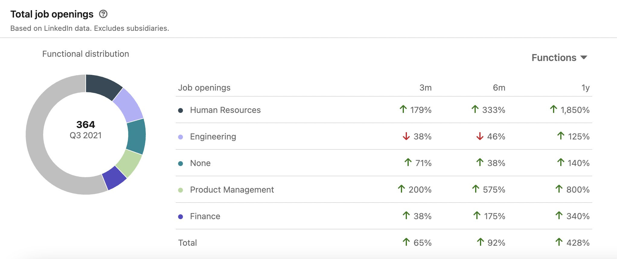 Job openings down over last three months by 23% but up 95% over last six months. Recent hires not from LinkedIn?