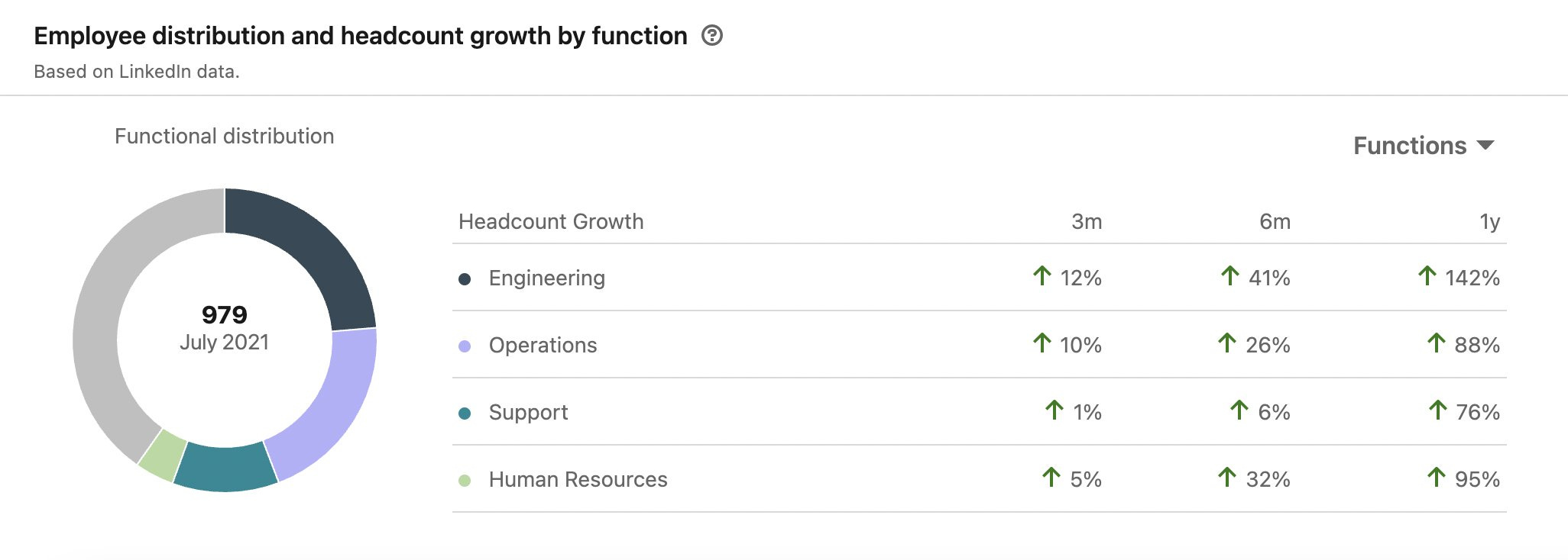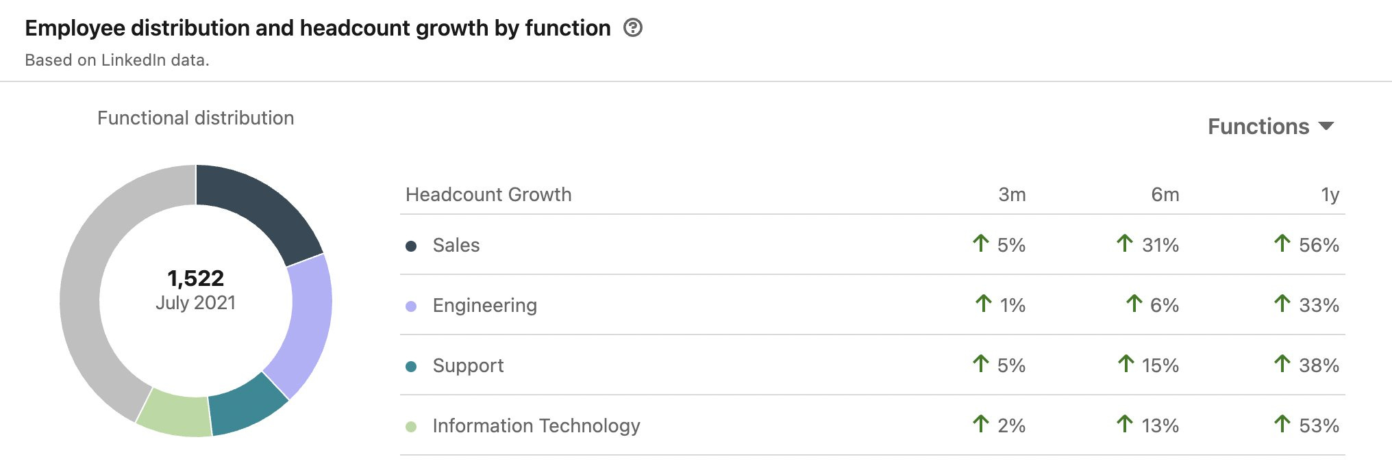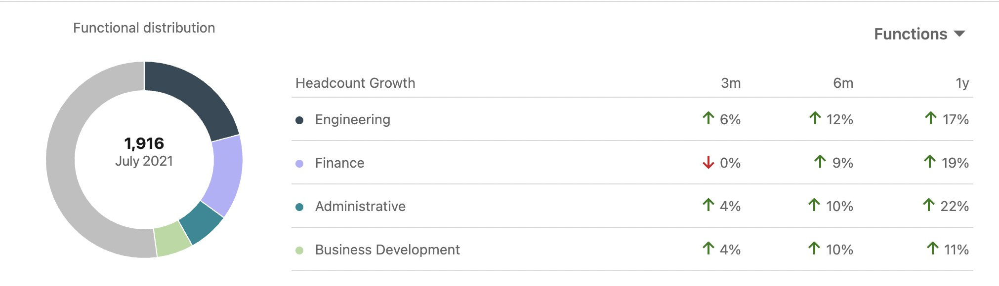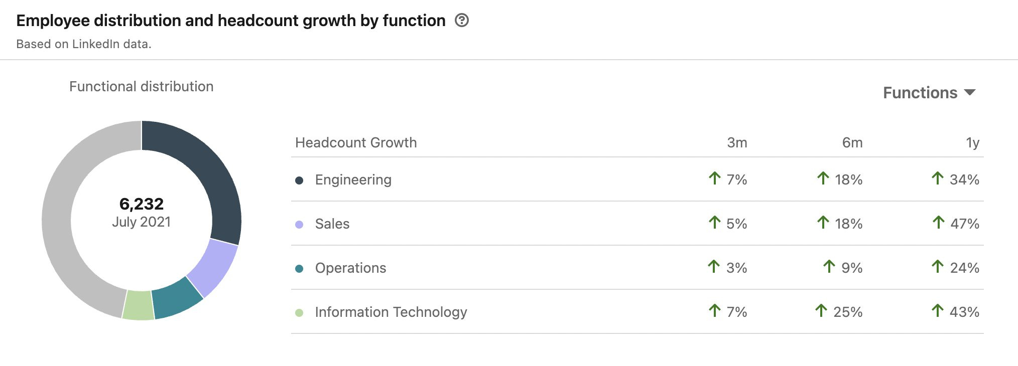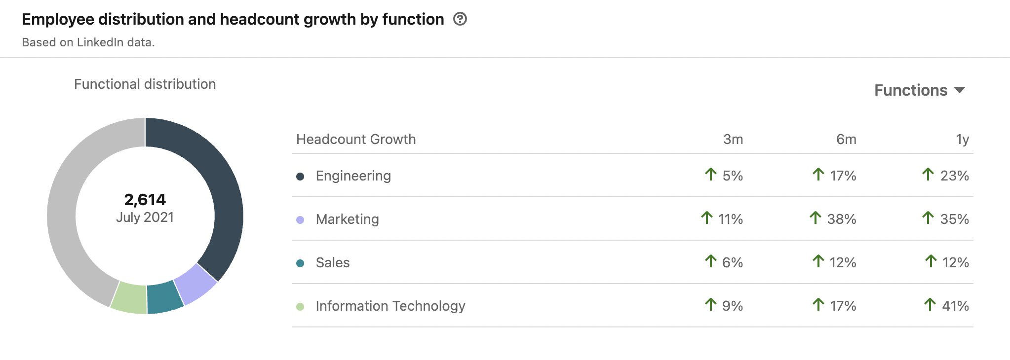 Very clean company headcount distribution with double digit six month department headcount growth across board