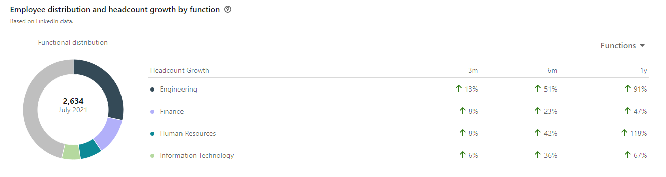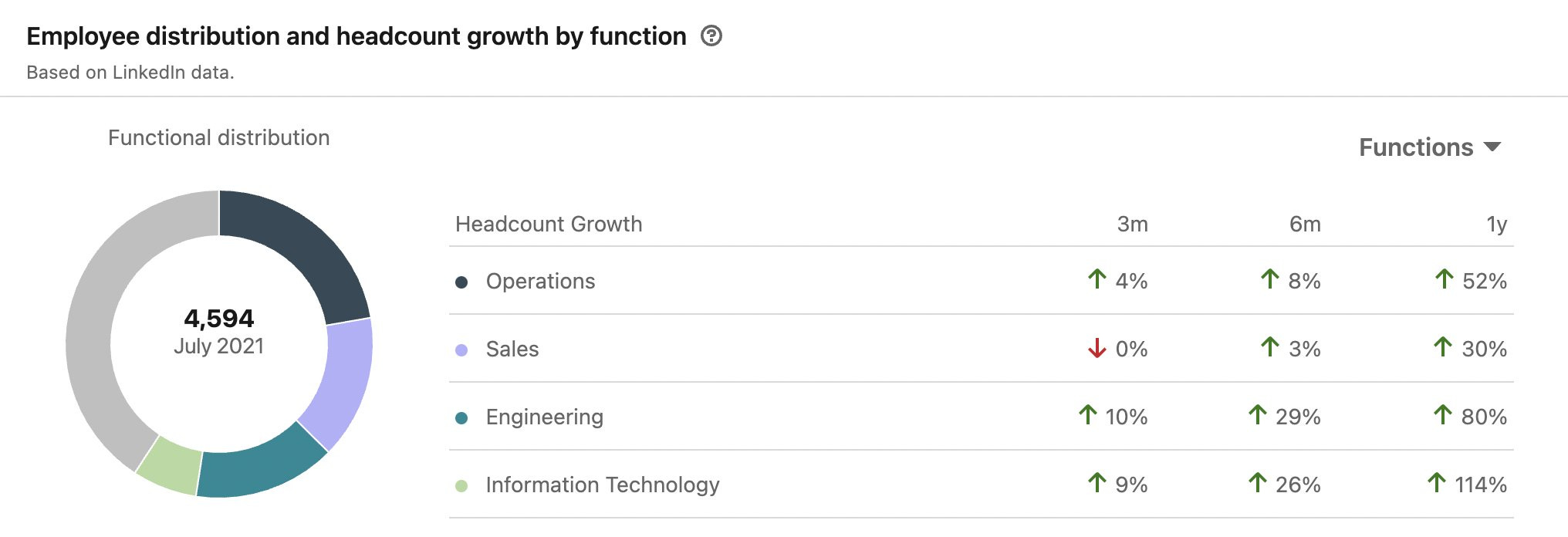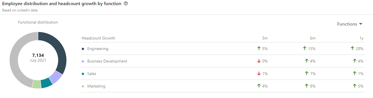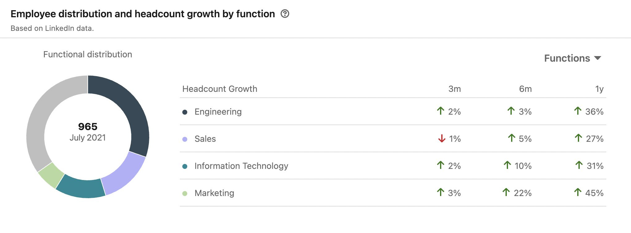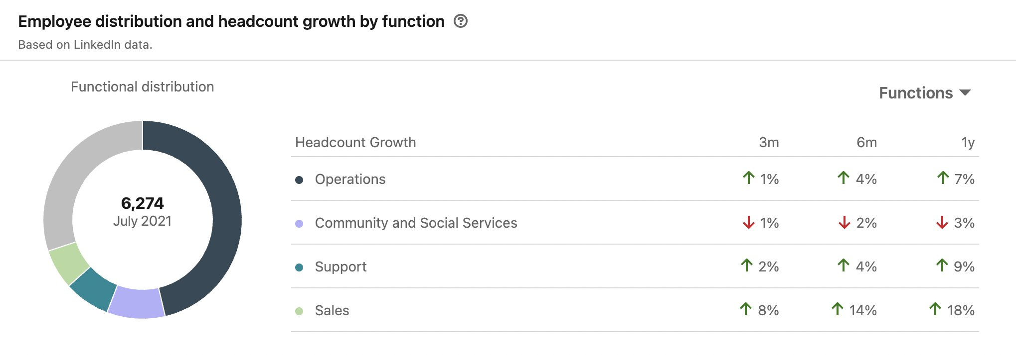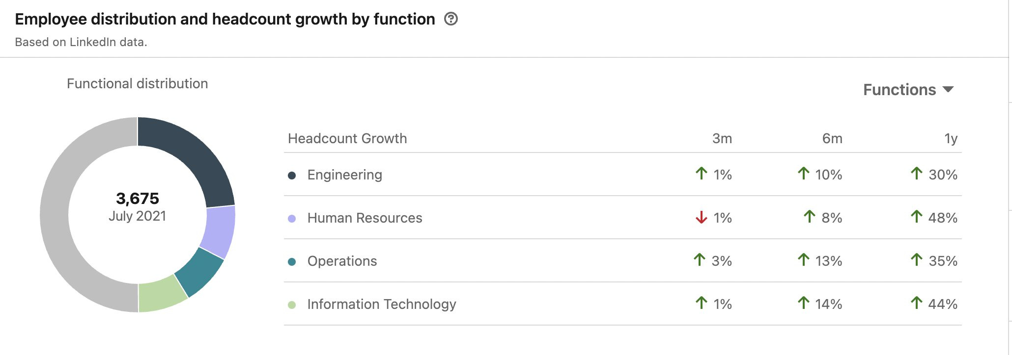 Very clean company headcount distribution with double digit six month department headcount growth across board