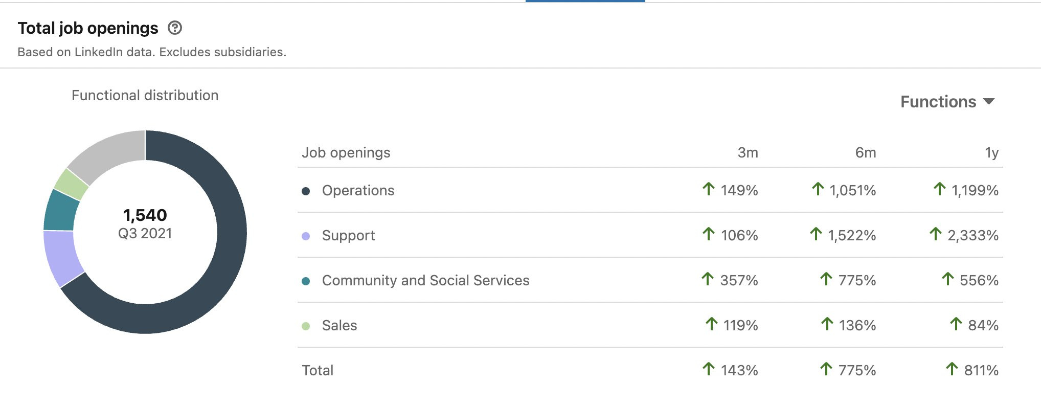 Big increase across the board in job openings - most notable 1208% increase for operations based positions over last six months
