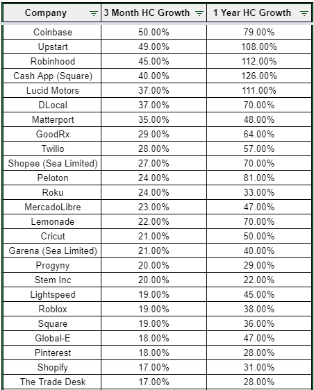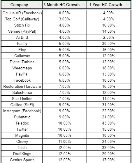 Taking a look at the top 25 companies experiencing the largest three month total headcount growth: