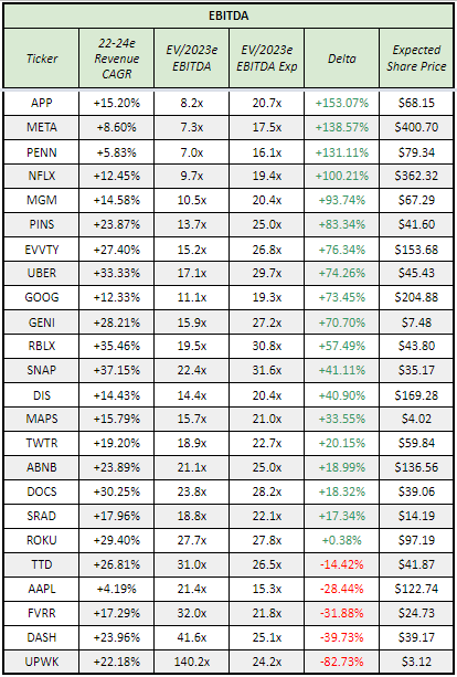Group (30): Apple AAPL 0.00%↑, Airbnb ABNB 0.00%↑, DoorDash DASH 0.00%↑, Disney DIS 0.00%↑, DraftKings DKNG 0.00%↑, Doximity DOCS 0.00%↑, Duolingo DUOL 0.00%↑, Evolution $EVV.TY, Meta Platforms META 0.00%↑, Fiverr FVRR 0.00%↑, Genius Sports GENI 0.00%↑, Alphabet GOOG 0.00%↑, Lemonade LMND 0.00%↑, Weedmaps MAPS 0.00%↑, MGM MGM 0.00%↑, Netflix NFLX 0.00%↑, Penn National PENN 0.00%↑, Pinterest PINS 0.00%↑, Roblox RBLX 0.00%↑, Roku ROKU 0.00%↑, Sea Ltd SE 0.00%↑, Snap SNAP 0.00%↑, Sportradar SRAD 0.00%↑, Trade Desk TTD 0.00%↑, Twitter TWTR 0.00%↑, Uber UBER 0.00%↑, Unity U 0.00%↑, Upwork UPWK 0.00%↑