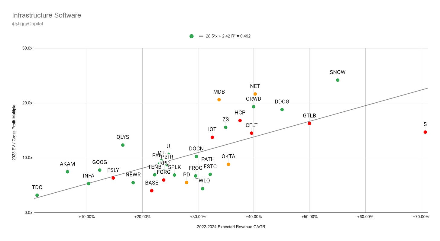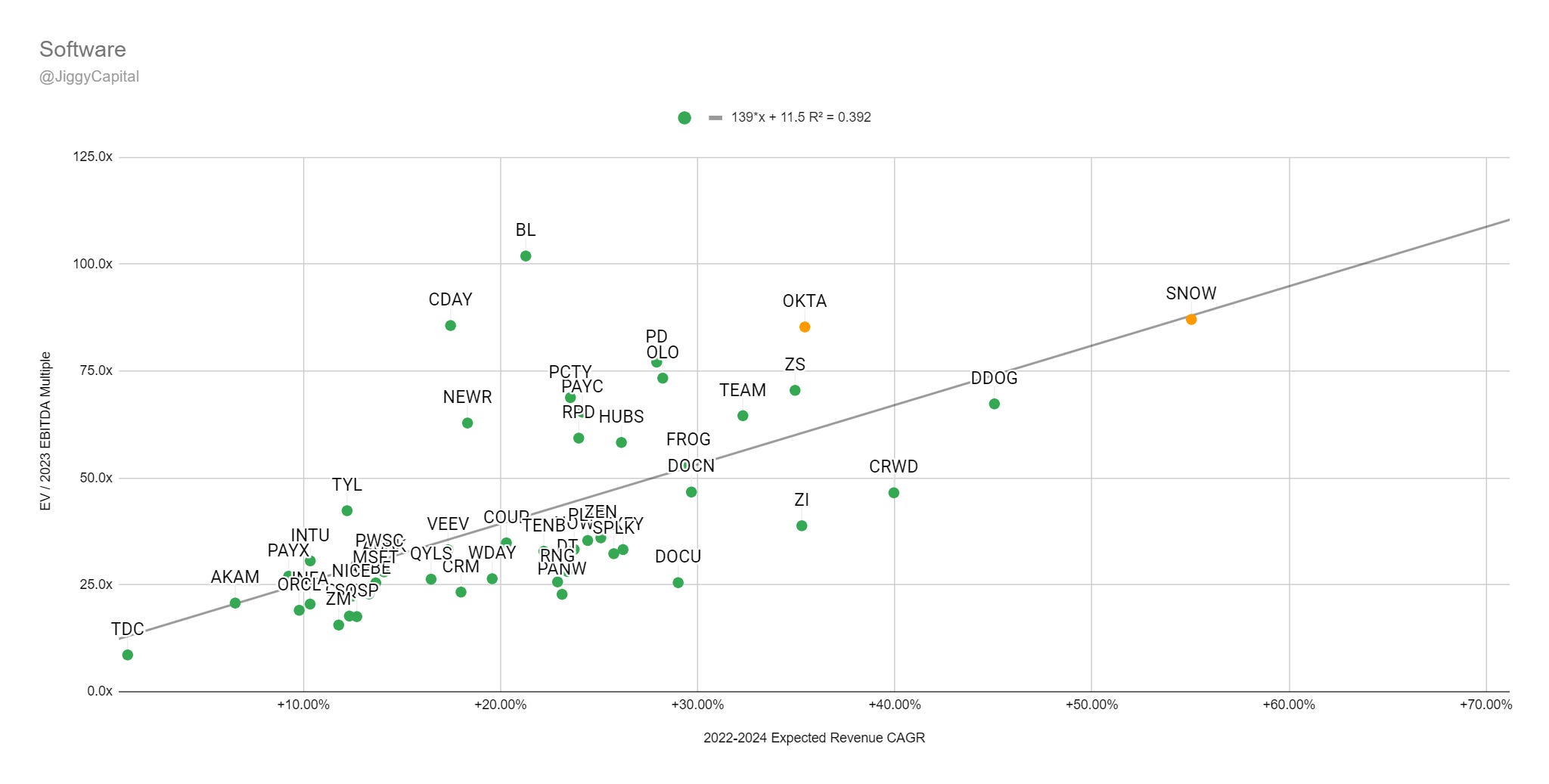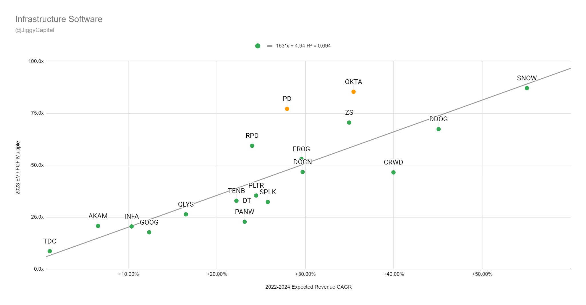 My Take: Much of the takeaways from the broken out software groups hold true for this as well, where RingCentral and Palo Alto Networks both stand out the most to me. In the more growth land, my scatter plot exercise would lead that Crowdstrike and ZoomInfo are also pretty attractive.