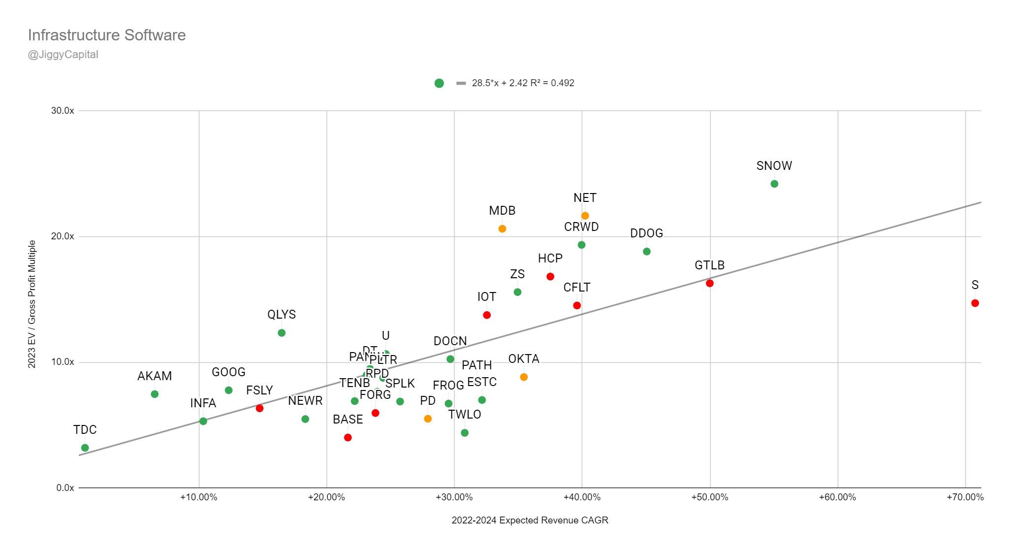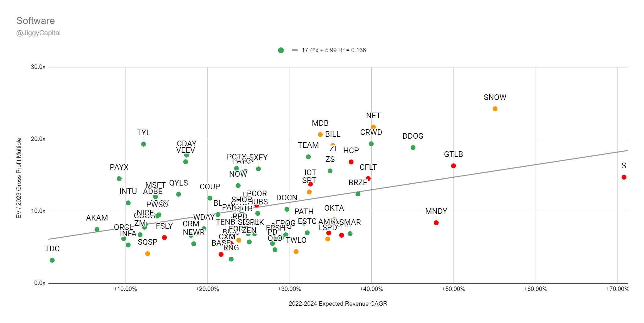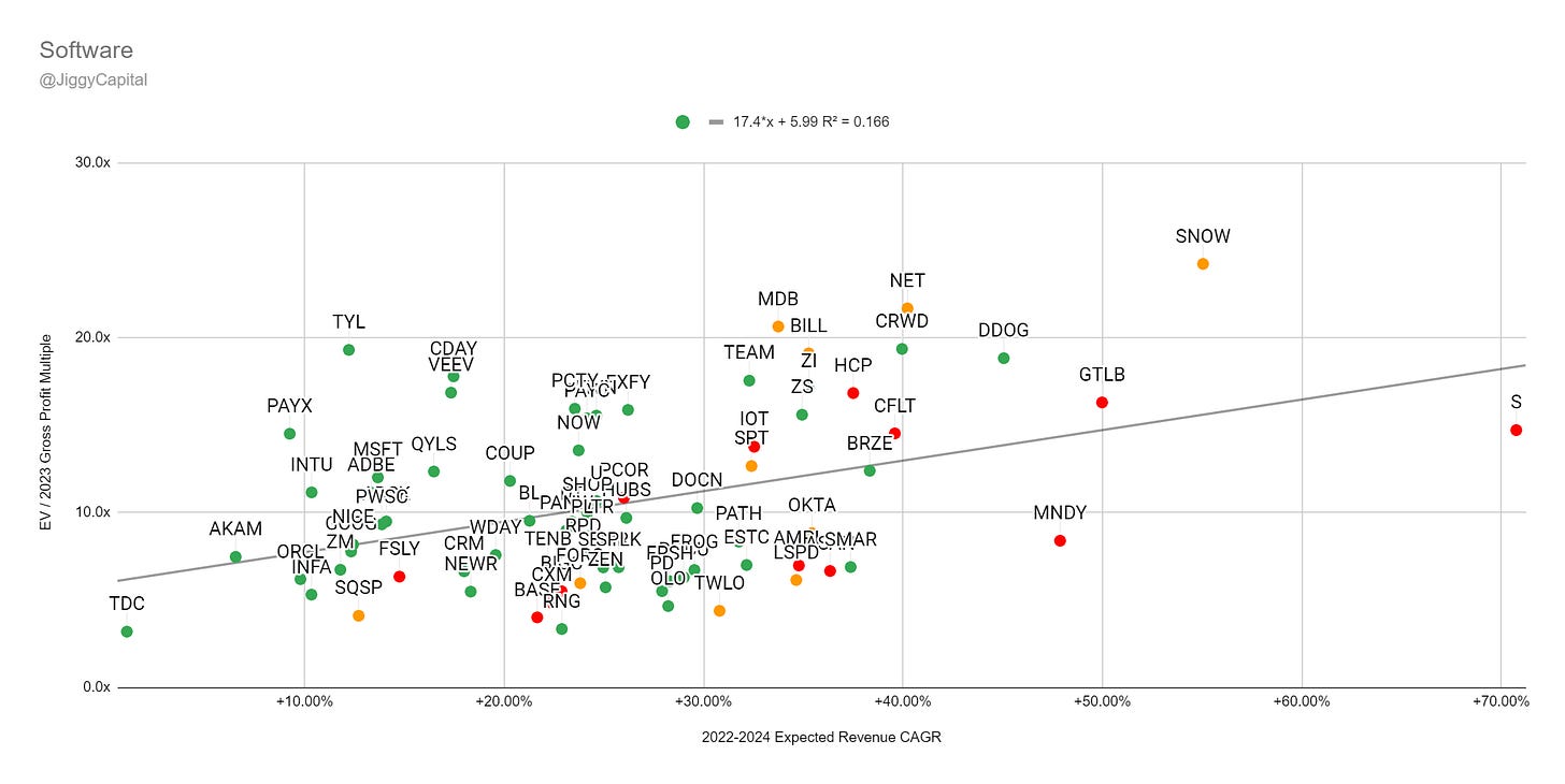 My Take: Much of the takeaways from the broken out software groups hold true for this as well, where RingCentral and Palo Alto Networks both stand out the most to me. In the more growth land, my scatter plot exercise would lead that Crowdstrike and ZoomInfo are also pretty attractive.