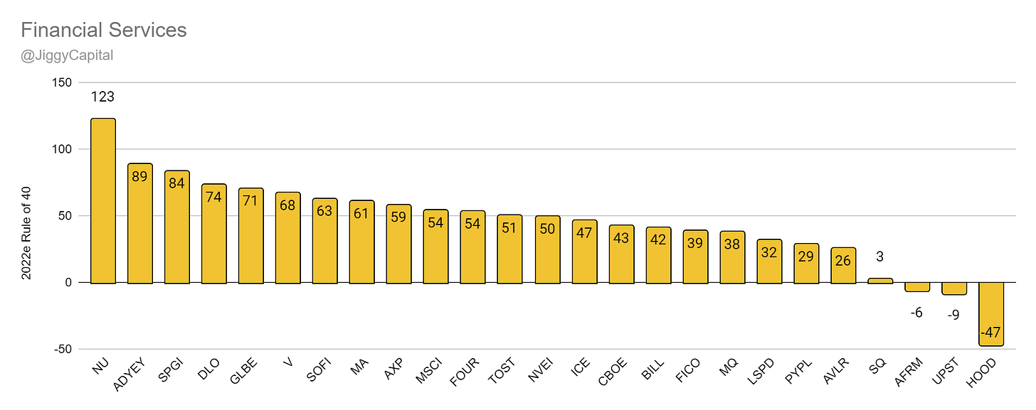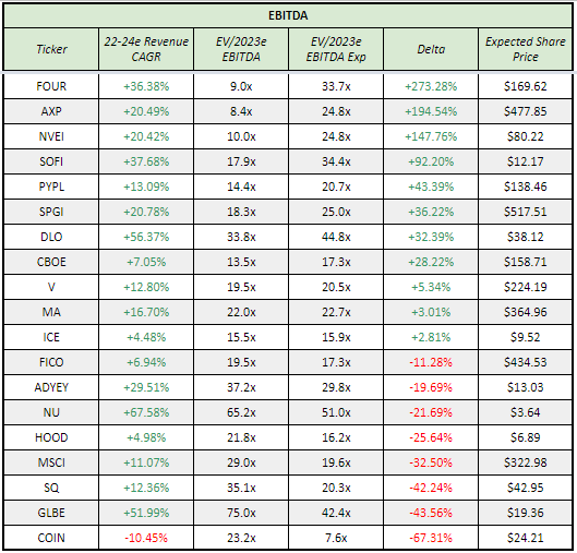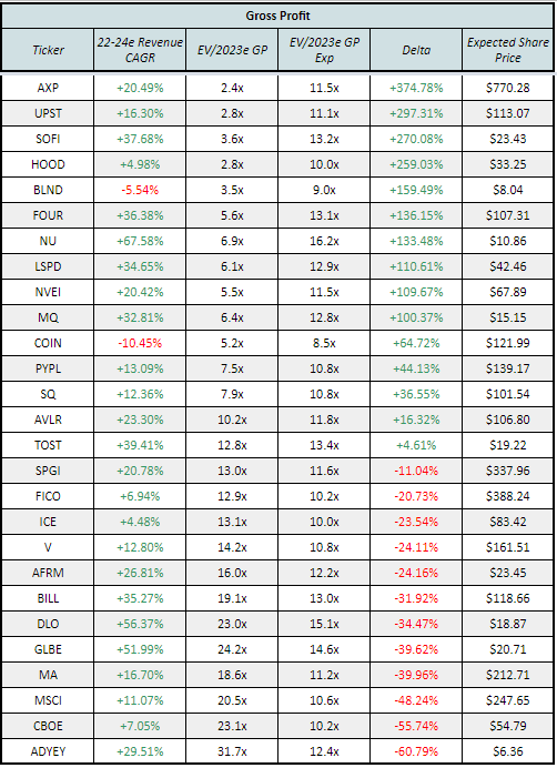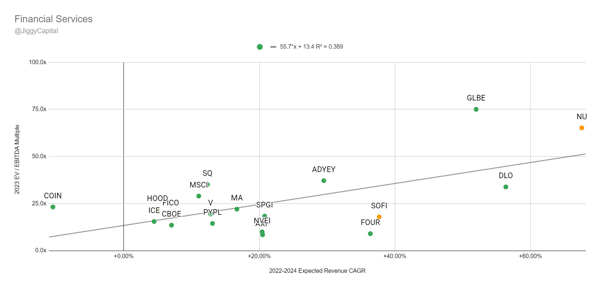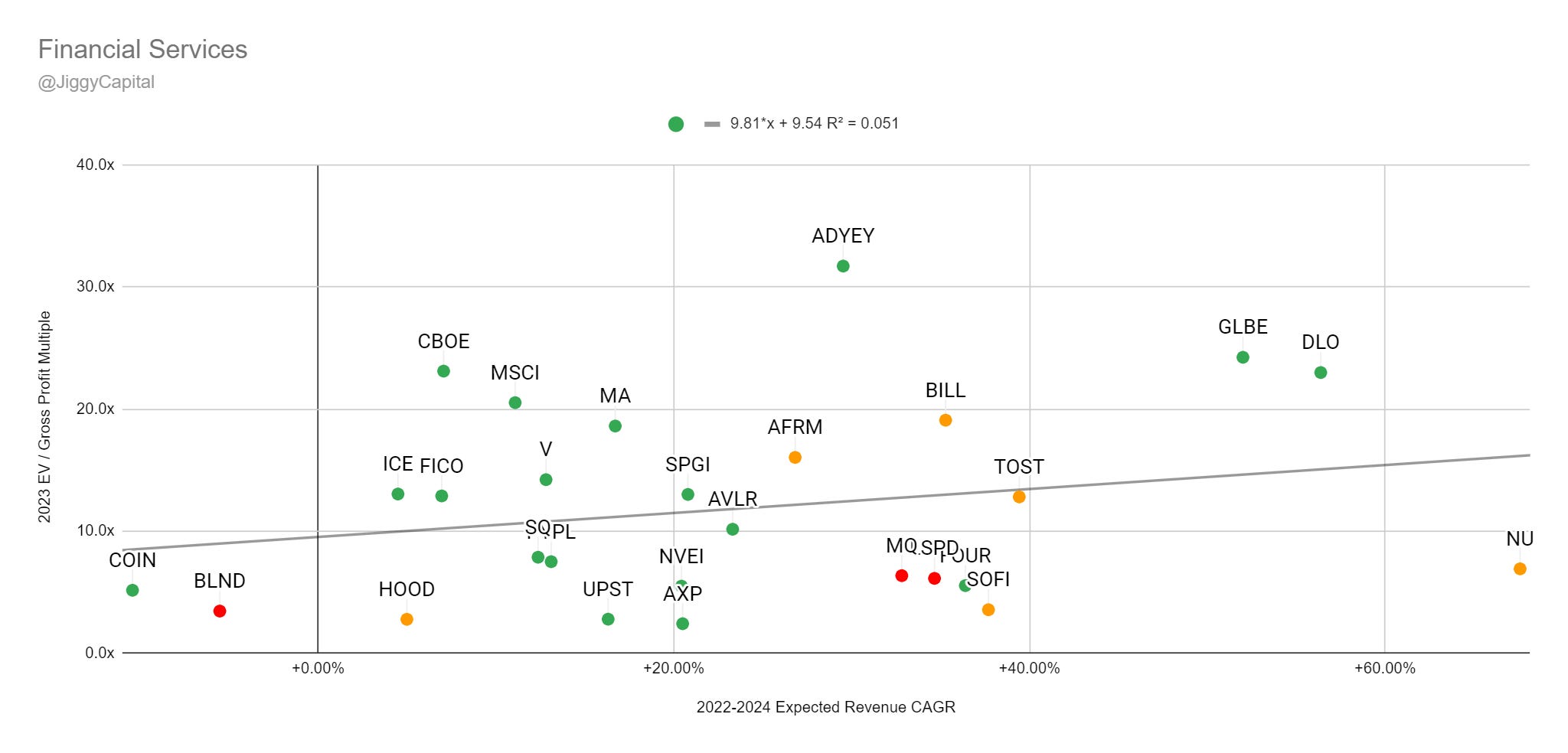 Group (27): Adyen $ADYEY, Affirm AFRM 0.00%↑, American Express AXP 0.00%↑, Bill.com BILL 0.00%↑, Blend Labs BLND 0.00%↑, Cboe CBOE 0.00%↑, Coinbase COIN 0.00%↑, dLocal DLO 0.00%↑, Fair Isaac FICO 0.00%↑, Shift4 Payments FOUR 0.00%↑, Global-E GLBE 0.00%↑, Robinhood HOOD 0.00%↑, Intercontinental Exchange ICE 0.00%↑, Lightspeed LSPD 0.00%↑, Mastercard MA 0.00%↑, Marqeta MQ 0.00%↑, Msci MSCI 0.00%↑, Nu NU 0.00%↑, Nuvei NVEI 0.00%↑, Paypal PYPL 0.00%↑, SoFi SOFI 0.00%↑, S&P Global SPGI 0.00%↑, Block SQ 0.00%↑, Toast TOST 0.00%↑, Upstart UPST 0.00%↑, Visa V 0.00%↑