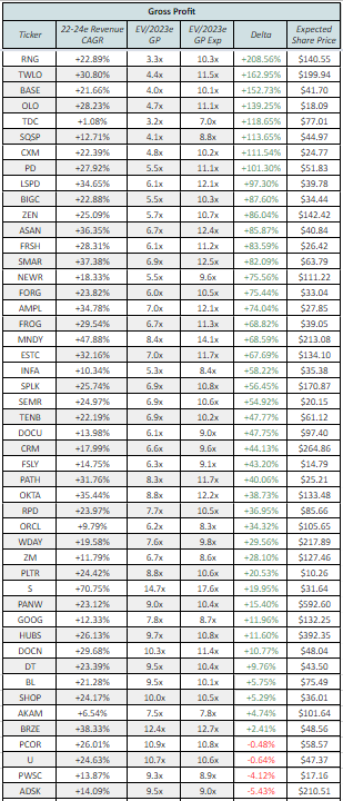 2022-2024 Projected Revenue CAGR vs. Enterprise Value / 2023 Expected Gross Profit (EV/2023 GP) Scatter Plot