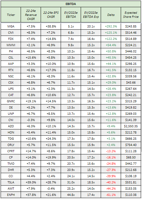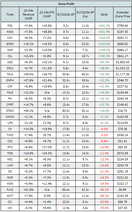 Scatter Plot Trendline Error Percentage: Using the sector scatter plot generated trendline equation, I look at the biggest discrepancies between their actual EV/2023e GP and EBITDA multiples versus their expected ones.