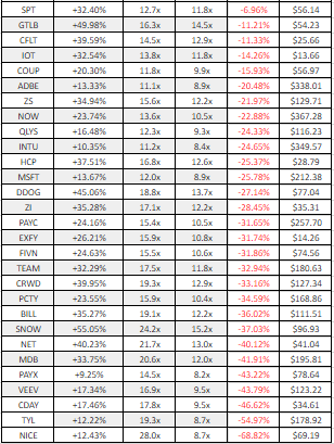 Group (45): Adobe ADBE 0.00%↑, Autodesk ADSK 0.00%↑, Amplitude AMPL 0.00%↑, Asana ASAN 0.00%↑, BigCommerce BIGC 0.00%↑, Bill.com BILL 0.00%↑, Blackline BL 0.00%↑, Braze BRZE 0.00%↑, Ceridian CDAY 0.00%↑, Coupa COUP 0.00%↑, Salesforce CRM 0.00%↑, Sprinklr CXM 0.00%↑, Docusign DOCU 0.00%↑, Expensify EXFY 0.00%↑, Five9 FIVN 0.00%↑, Freshworks FRSH 0.00%↑, Alphabet GOOG 0.00%↑, HubSpot HUBS 0.00%↑, Intuit INTU 0.00%↑, Lightspeed LSPD 0.00%↑, Monday.com MNDY 0.00%↑, Microsoft MSFT 0.00%↑, Nice NICE 0.00%↑, ServiceNow NOW 0.00%↑, Olo OLO 0.00%↑, Oracle ORCL 0.00%↑, Paycom PAYC 0.00%↑, Procore PCOR 0.00%↑, Paylocity PCTY 0.00%↑, Powerschool PWSC 0.00%↑, RingCentral RNG 0.00%↑, Semrush SEMR 0.00%↑, Shopify SHOP 0.00%↑, Smartsheet SMAR 0.00%↑, Sprout Social SPT 0.00%↑, Squarespace SQSP 0.00%↑, Atlassian TEAM 0.00%↑, Toast TOST 0.00%↑, Tyler TYL 0.00%↑, Veeva VEEV 0.00%↑, Workday WDAY 0.00%↑, Zoom ZM 0.00%↑